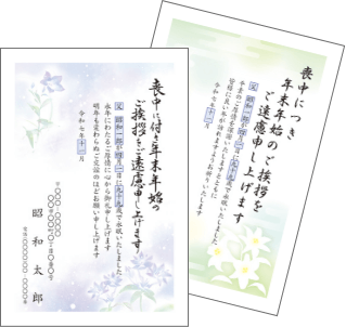 一般的なご挨拶の文例や久しく連絡をとっていない方への文例などさまざまなデザインをご用意しております。普段年賀状にてご挨拶をしている方や故人の葬儀に参列いただいていた方などお世話になった方々にお送りする年末のご挨拶です。お早めのご投函をいたしましょう。こちらは通常はがき(官製はがき・胡蝶蘭)、私製はがきのいずれかをお選びいただけます。