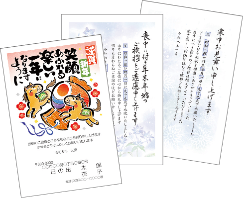 年賀状には、カラー、写真入り年賀状、ビジネス年賀状、1色・2色年賀状がございます。喪中はがきには、カラー、1色がございます。寒中見舞いには、カラー、1色がございます。ご希望の種類をお選びいただき次の、お客様情報入力画面へお進みください。